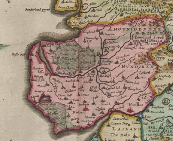 The web pages are limited to digests, focusing on he Fylde, my home turf. This is on the Lancashire coast in England, bordered to the north by the River Wyre, and to the south by the River Ribble, and to the west of Preston (shown in the map at Fig 1. to the south of the red area named Amounderness Hundred).
